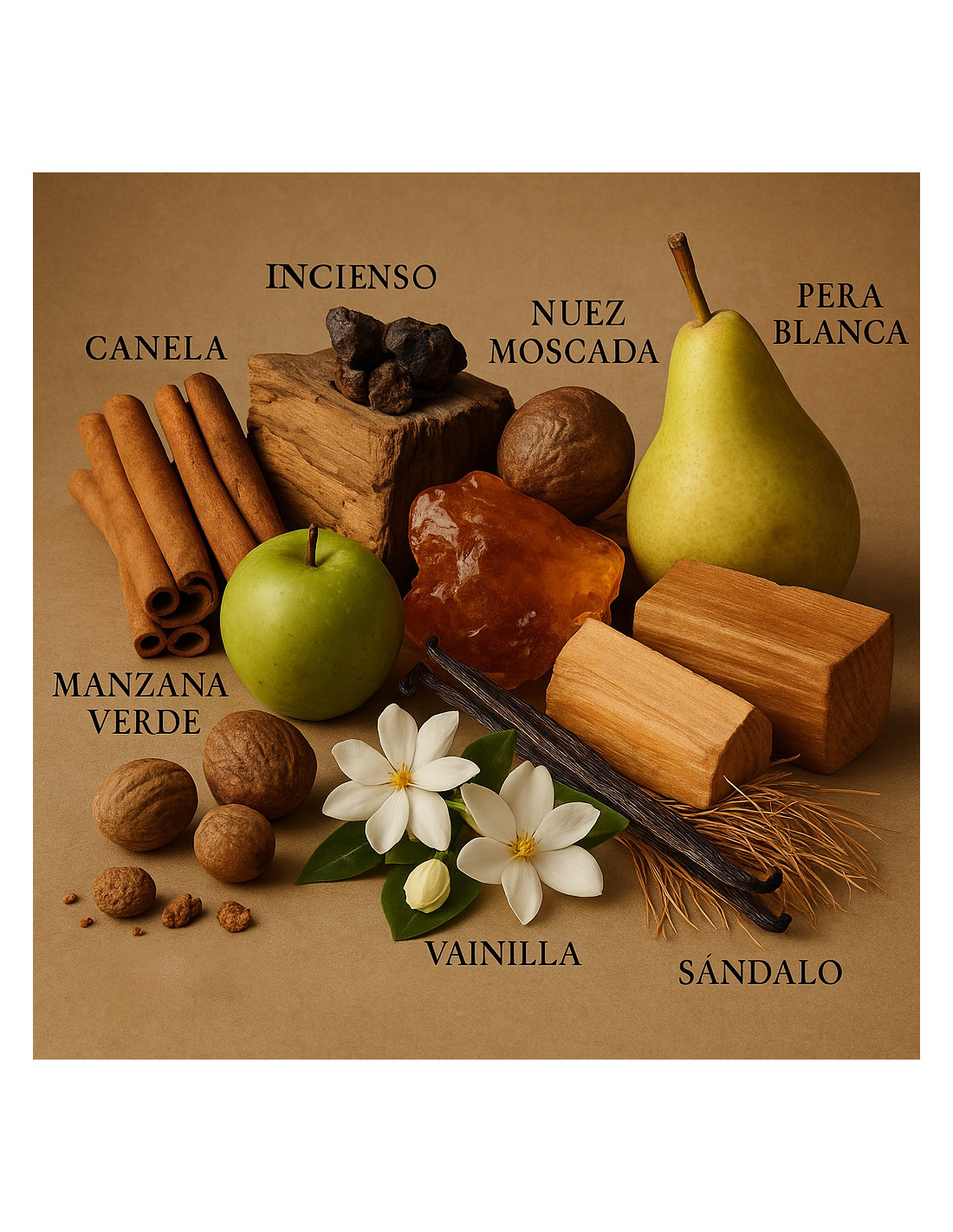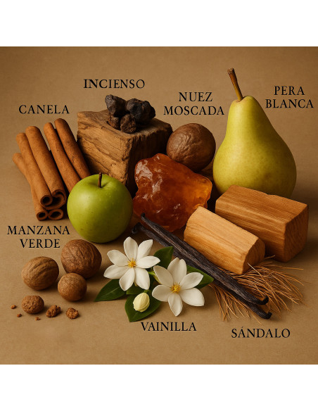 Tête : safran, cannelle, encens, noix de muscade, pêche blanche, pomme verte, oud népalais.