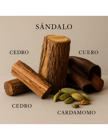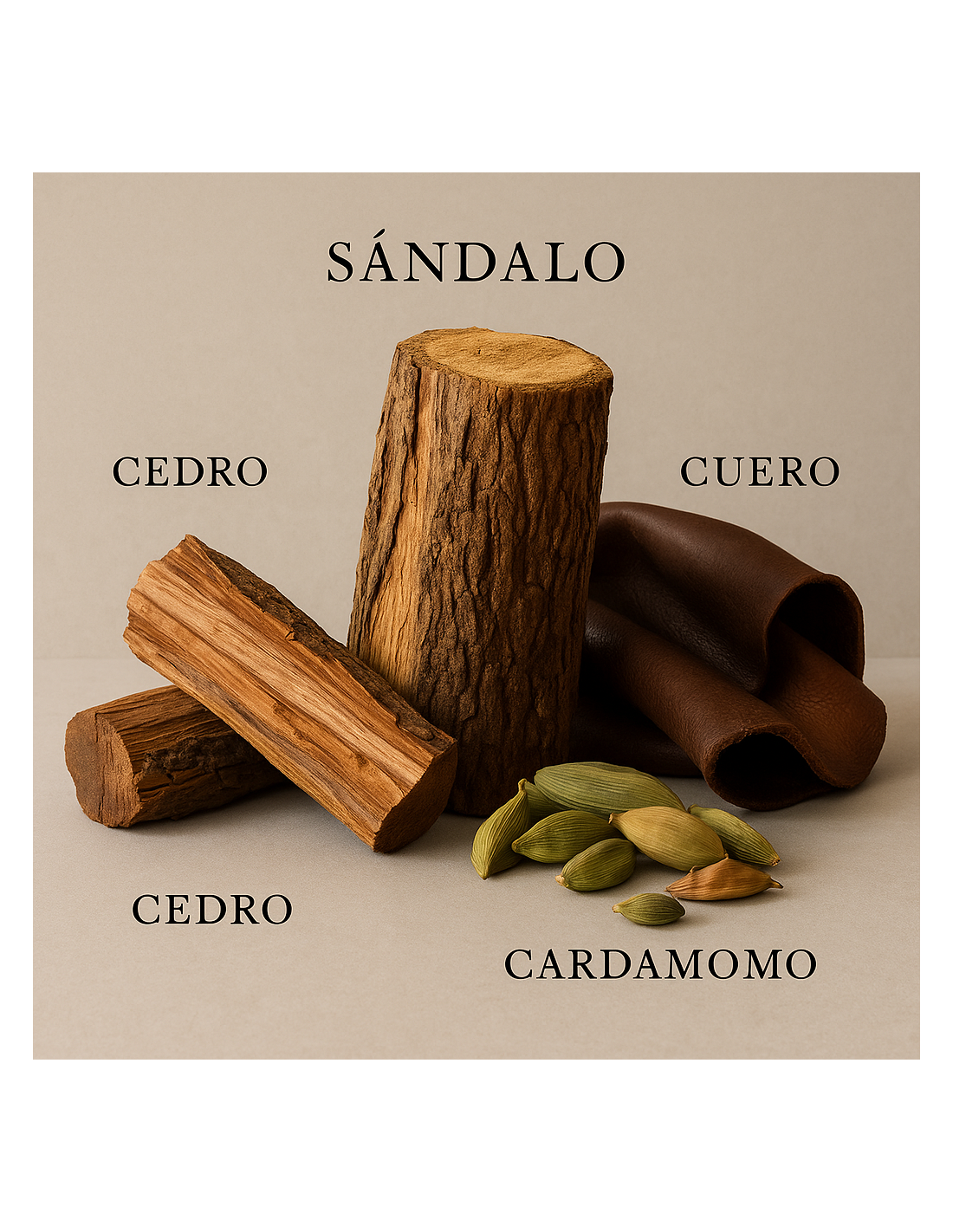 Aux côtés du santal, le cèdre, le papyrus et la cardamome composent un accord à la fois doux, subtilement fumé et légèrement épicé. En fond, comme un murmure, le cuir se fond dans les bois, apportant une nuance fumée raffinée.