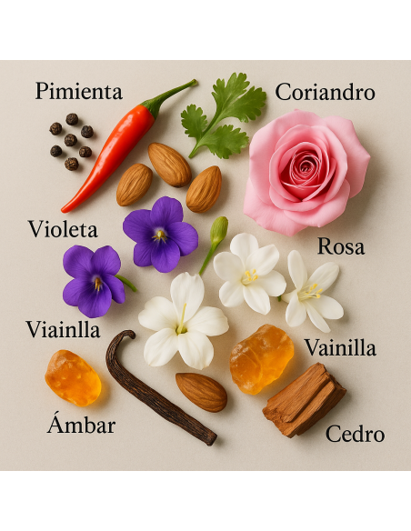 C’est un parfum profondément ambré. Les notes de tête sont fraîches et énergisantes, avec une explosion de poivre et d’amandes douces qui éveillent les sens dès les premiers instants. En cœur, la délicatesse de la violette se marie à la fleur exotique d’Osmanthus, créant un bouquet floral séduisant et addictif.