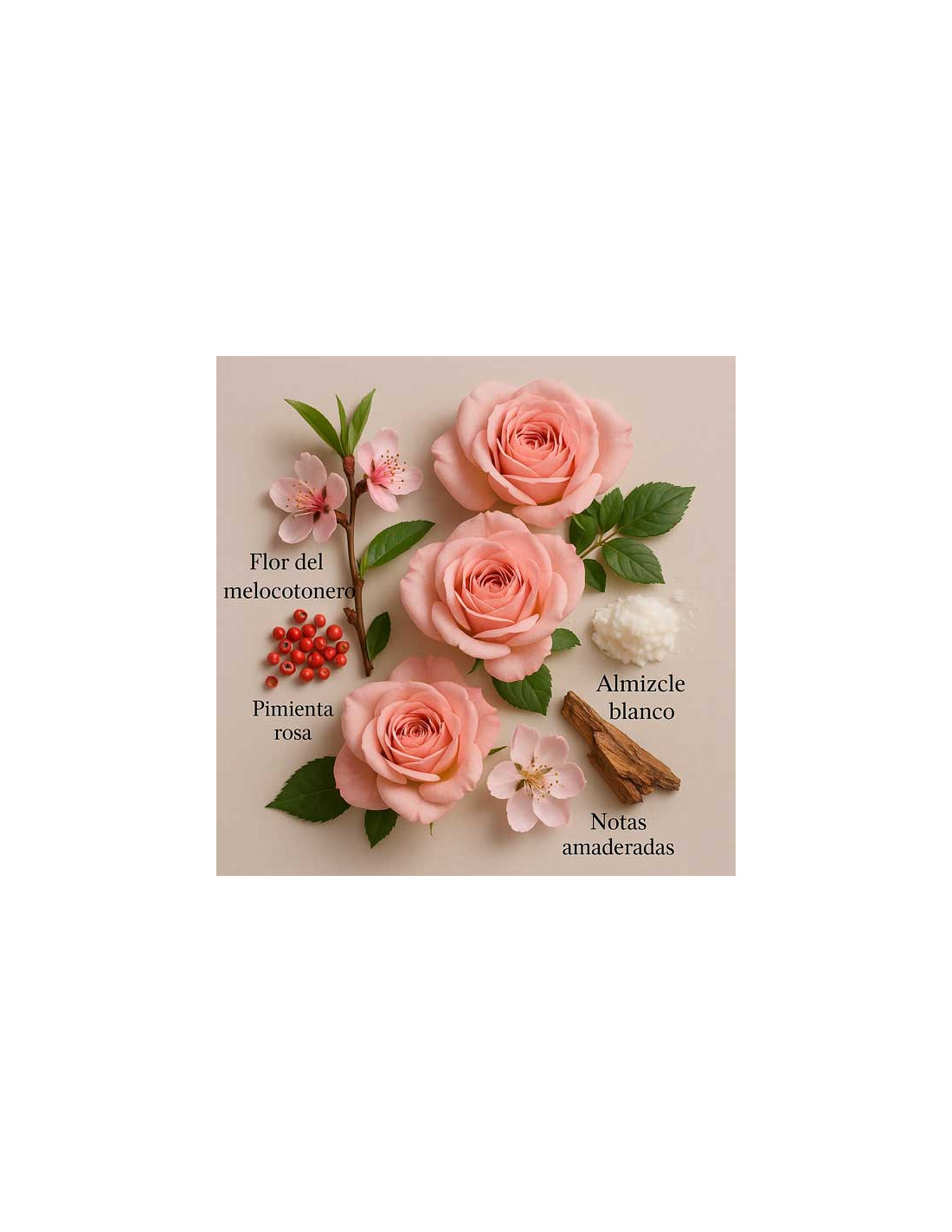 Fond : notes boisées, musc blanc, ambre.