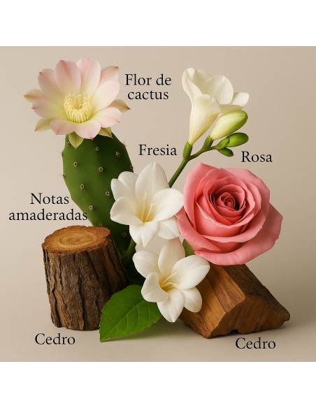 Son sillage est frais et délicat, comme un bouquet de fleurs blanches fraîchement coupées. Élaboré autour de la fleur de cactus, il évolue progressivement vers un floral doux et lumineux.