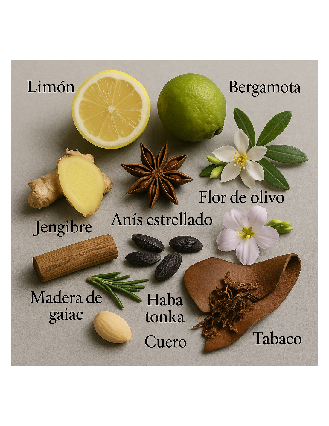 Au cœur du parfum se trouvent des notes aromatiques de romarin et de fleur d'olivier , ajoutant une touche épicée et vibrante, tandis que le bois de gaïac doux adoucit le mélange et ajoute une touche plus élégante et sophistiquée. Enfin, le parfum s'installe dans une base chaude et boisée de fève tonka, d'ambre gris et de musc, apportant une sensation de profondeur et de mystère au mélange.