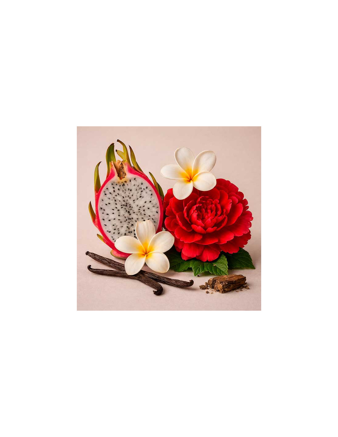 Boom è un’esplosione di vitalità che ruota attorno alla seduzione inaspettata della pitaya (frutto del drago). La sua apertura frizzante sprigiona la freschezza succosa e tropicale di questo frutto del drago, vibrante e luminoso, che imprime fin da subito il carattere unico del profumo. Nel cuore, la dolcezza vellutata della ciliegia si fonde con la morbidezza floreale della peonia e l’esotismo del frangipani rosso, avvolgendo la nota fruttata in un alone inebriante e femminile. La fragranza si adagia su un fondo dorato, di vaniglia con sfumature di patchouli, caldo e confortante.