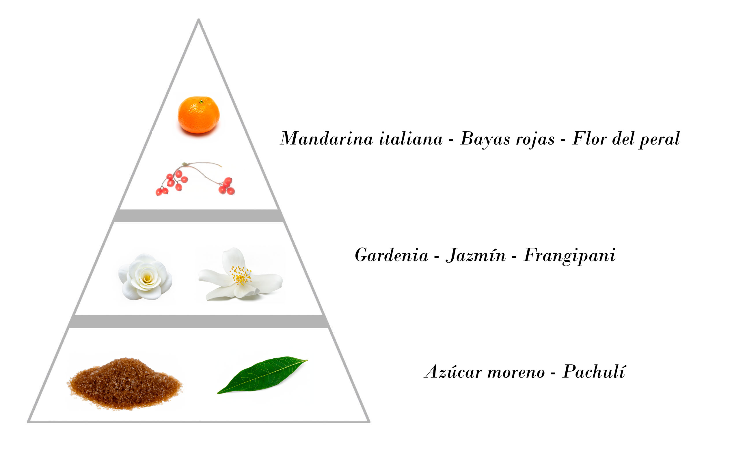 Nelle note di fondo, il patchouli dona una profondità terrosa ed elegante, delicatamente addolcita dall’accordo di zucchero di canna, che avvolge la fragranza in una scia dolce e avvolgente. Il risultato è un profumo che equilibra il floreale bianco, il fruttato e il gourmand in un aroma distintivo e sofisticato.