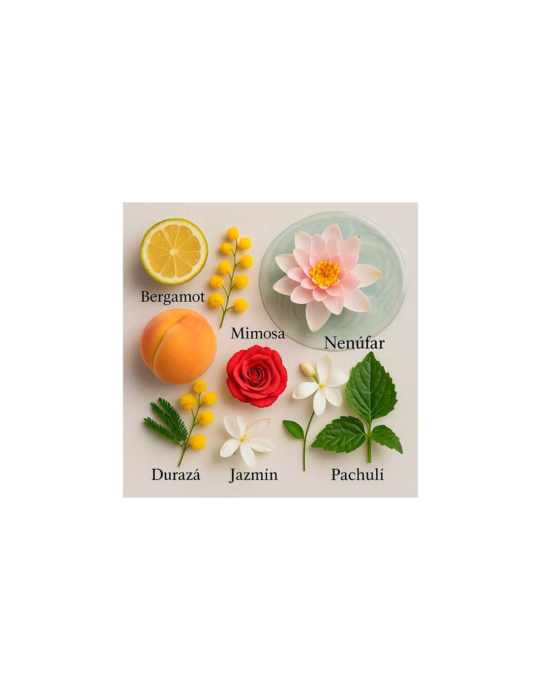Le note di testa uniscono mandarino, pesca e bergamotto, offrendo un tocco fresco, dolce e fruttato. I fiori acquatici, come il ninfea, si fondono con i fiori d’arancio e la mimosa. Alla base, la fragranza diventa più calda e sensuale con sandalwood, patchouli, vaniglia e fava tonka.