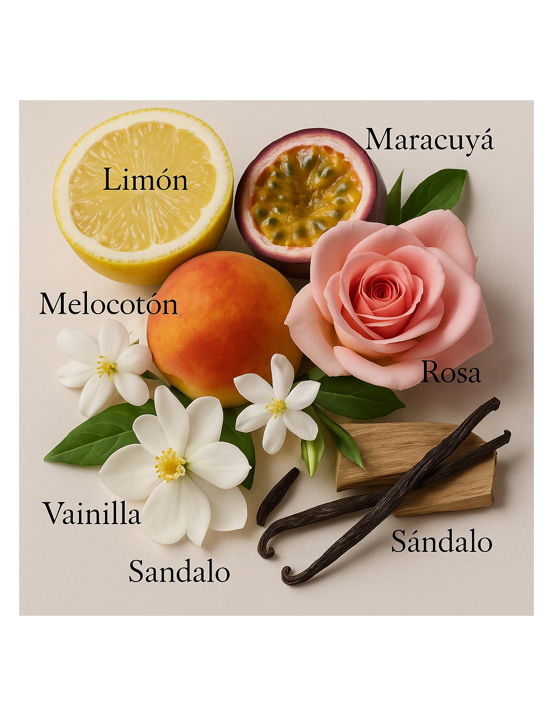 La fragranza si apre con un accordo fruttato di mandarino, bergamotto e pesca. Nel cuore emerge un bouquet floreale morbido e sofisticato composto da gelsomino, ninfea e peonia. Sul fondo, compaiono note calde e profonde di vaniglia, sandalo, vetiver e ambra, che avvolgono la pelle con sensualità duratura ed eleganza senza tempo.