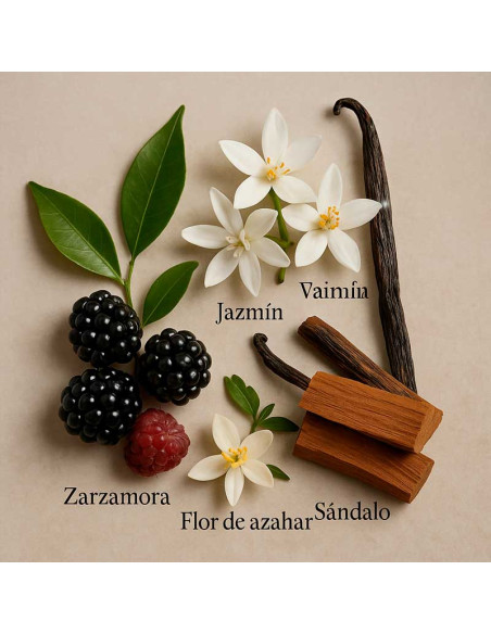 L’apertura di frutti rossi e arancia dona un tocco frizzante e luminoso. Nel cuore, una miscela di gelsomino sambac e assoluta di rosa di Damasco aggiunge femminilità ed eleganza. La fragranza si chiude con un fondo avvolgente di vaniglia, sandalo di Mysore e fava tonka, lasciando una scia calda e avvolgente.