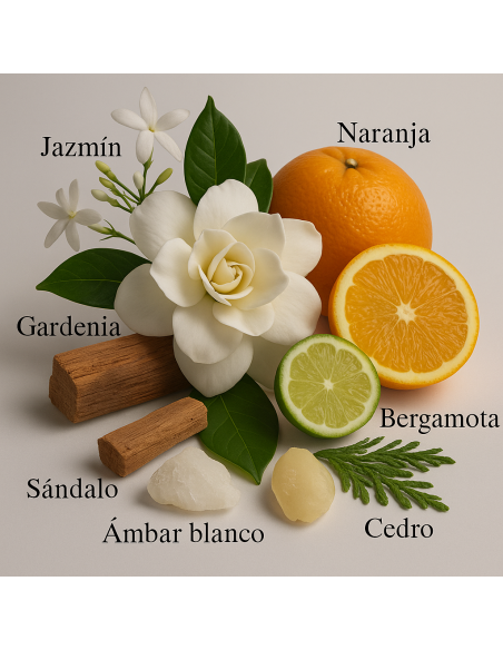 L’apertura, con un tocco di arancia amara e mandarino, dona freschezza e un carattere agrumato vibrante. Nel cuore, una raffinata miscela di gelsomino, fiore d’arancio e gardenia aggiunge femminilità ed eleganza. Il fondo diventa cipriato e ambrato, con un abbraccio avvolgente di legni, ambra e assoluta di fava di cacao, lasciando una scia profonda e avvolgente.