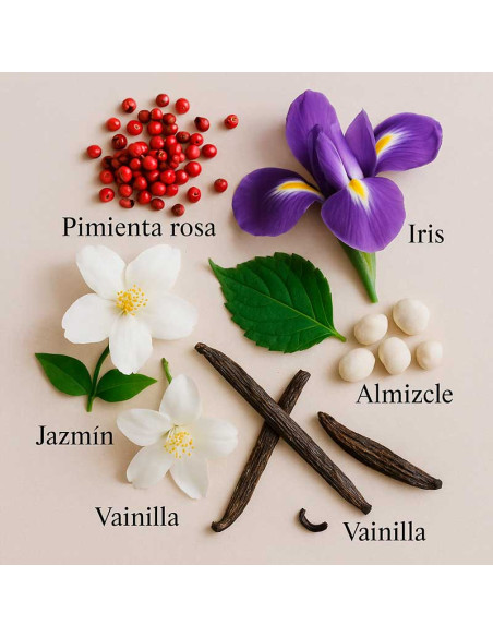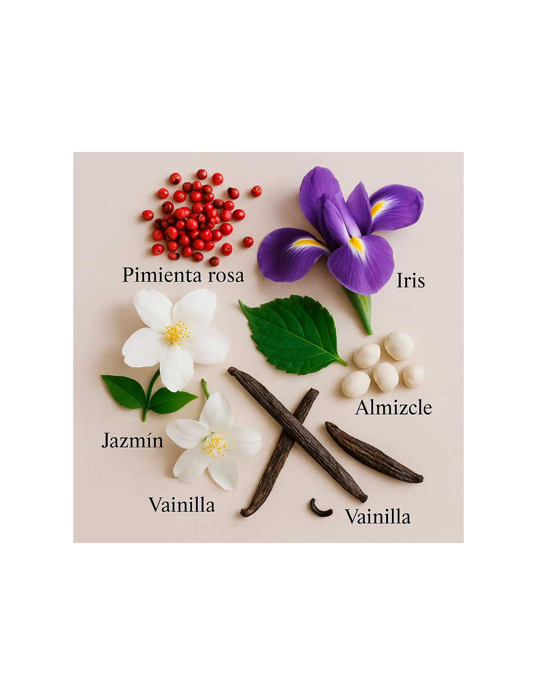 L’apertura di ananas, pepe rosa e gelsomino dona una sensazione dolce e brillante. Nel cuore, gelsomino e rosa bulgara creano un bouquet femminile e delicato. Il fondo si distingue per le note verdi di vetiver fresco e la morbidezza avvolgente del muschio bianco, lasciando una scia pulita, elegante e piacevole.
