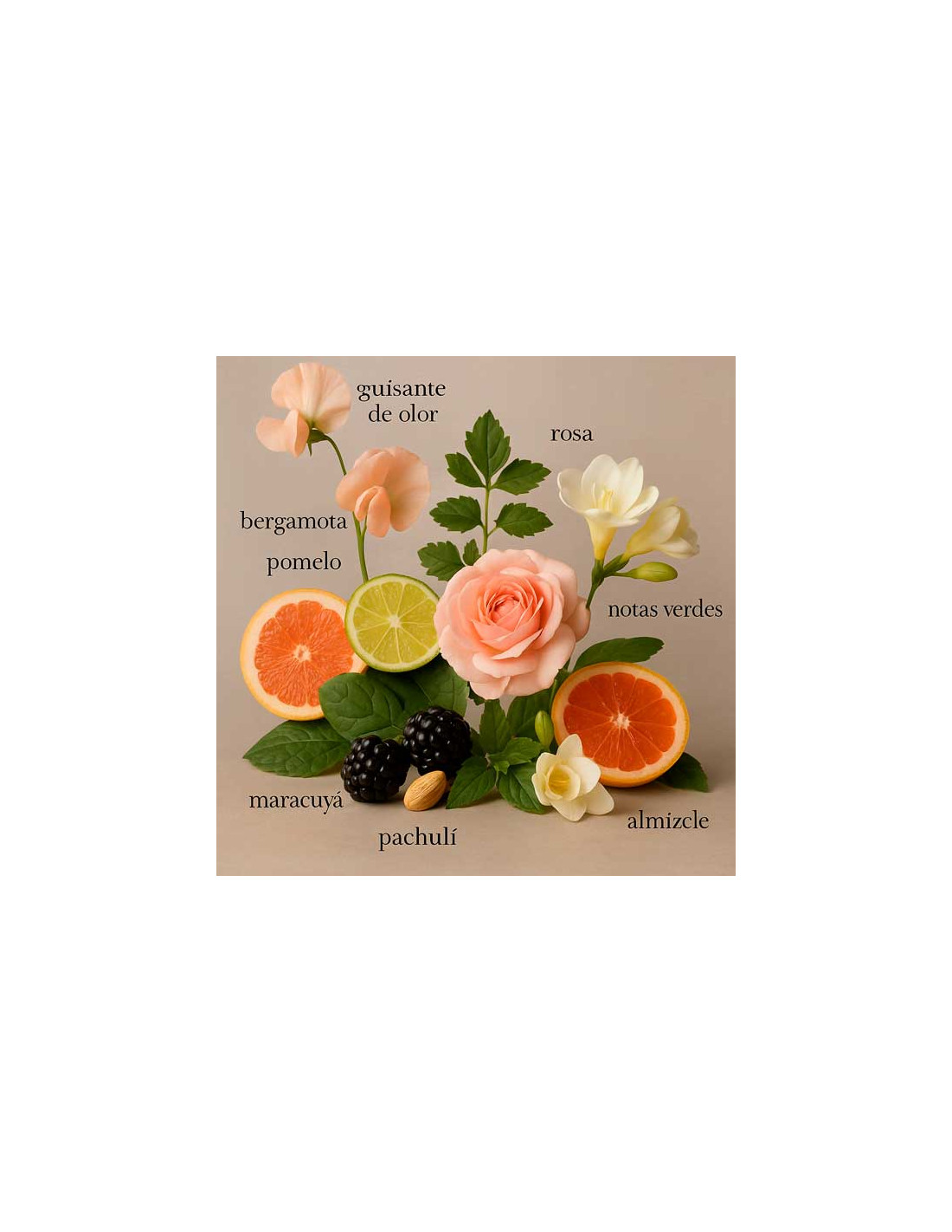 L’apertura si schiude con note di pisello odoroso e bergamotto, offrendo una sensazione fresca e rinvigorente. Nel cuore, la combinazione di geranio, mela cotogna e fresia dona un carattere floreale e femminile che avvolge delicatamente la pelle. Il fondo di patchouli e rosa di Damasco aggiunge una nota calda e terrosa che rende la fragranza unica e memorabile.