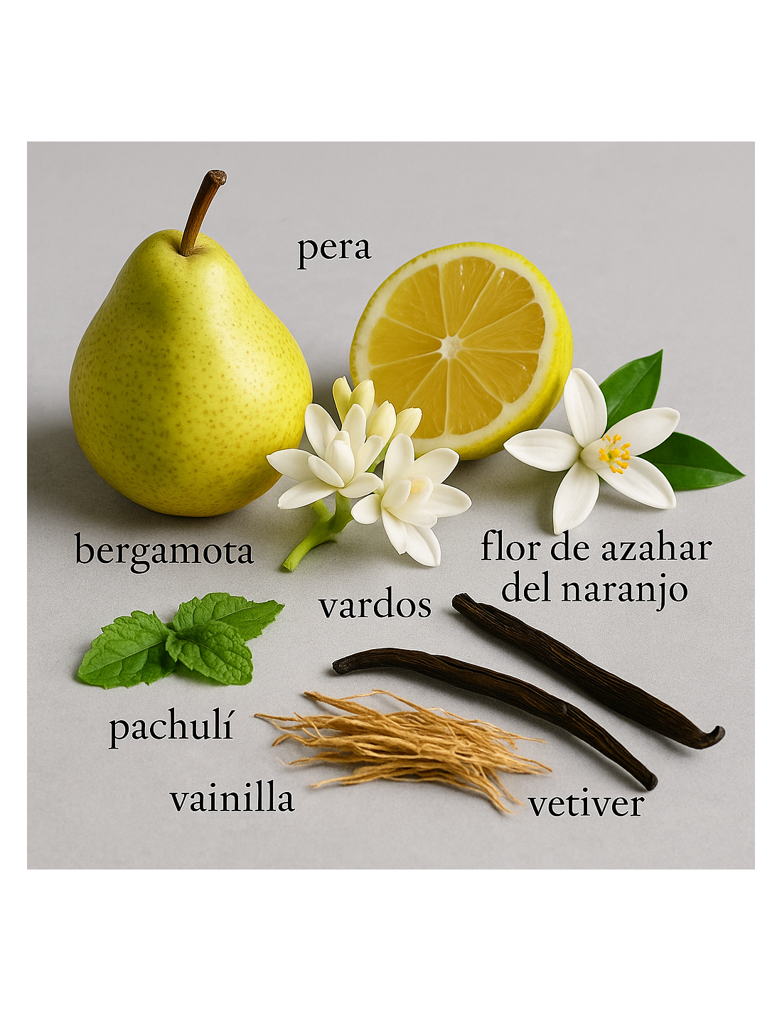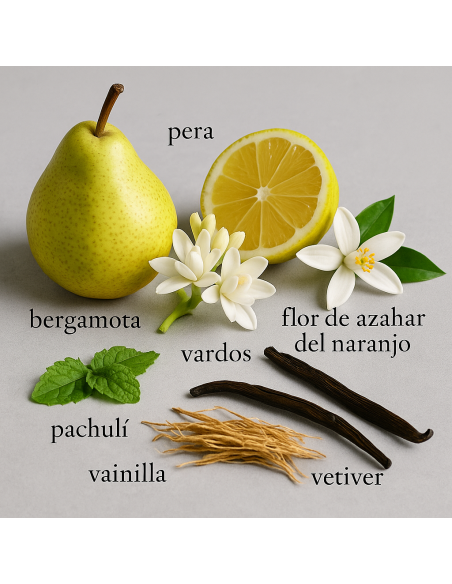 Le note di testa, con un tocco di fiore d’arancio e gelsomino, donano una sensazione fresca e luminosa con sfumature fruttate. Nel cuore, una miscela di vetiver, nardo e tuberosa aggiunge carattere, femminilità e raffinatezza. La fragranza si conclude con un fondo avvolgente di muschio, sandalo di Mysore e patchouli, lasciando una scia intensa ed elegante.