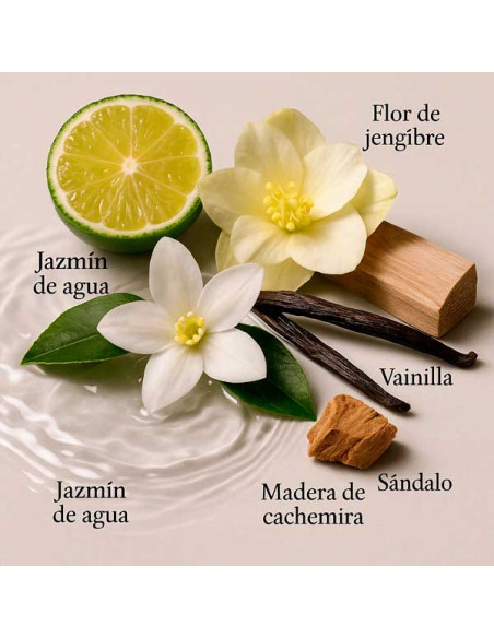 L’apertura, con un mix di mandarino verde e fiore di zenzero, dona una sensazione fresca e frizzante. Nel cuore, l’accordo di sale e vaniglia esalta la sensualità, mentre il gelsomino acquatico aggiunge un tocco di purezza. Infine, il fondo di ambra grigia, sandalo e legno di cashmere crea una scia calda, avvolgente e profondamente coinvolgente.