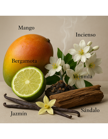 L’apertura unisce mango, bergamotto e albicocca, creando un inizio succoso e luminoso. Nel cuore, una miscela sofisticata di gelsomino sambac, rosa e incenso dona carattere e mistero. La base di vaniglia e sandalo avvolge la pelle con un calore morbido, sensuale e profondamente irresistibile.