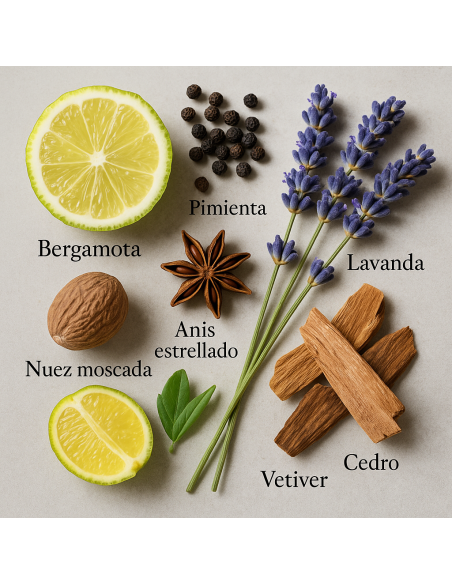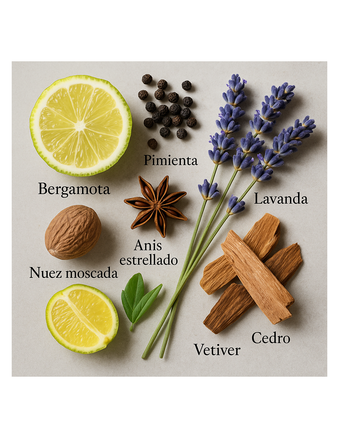 La fragranza si apre con vibranti note di testa di bergamotto fresco e pepe di Sichuan speziato, che lasciano il posto a un cuore aromatico di vaniglia, pepe nero e zenzero. La base legnosa è composta da note di cedro, sandalo e ambra, che si fondono perfettamente per creare un profumo maschile potente e duraturo.