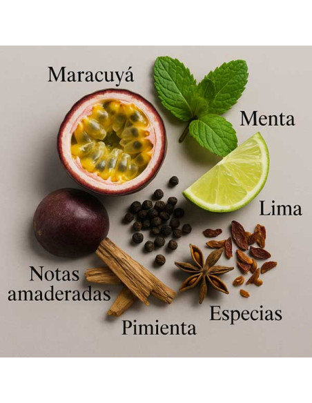 Com notas vibrantes de pimenta, menta e maracujá, abre com uma explosão de energia e vitalidade. No coração da fragrância estão notas de gengibre e pimenta preta que dão um toque picante e sedutor. Na base, misturam-se notas amadeiradas e de couro que lhe conferem um toque final de masculinidade e elegância.