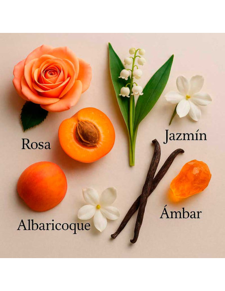 As notas de saída combinam pele de pêssego e damasco. No coração, surge um bouquet de jasmim, rosa e lírio-do-vale, que confere sofisticação e delicadeza. No fundo, a fragrância torna-se mais quente e sensual com notas de sândalo, baunilha e almíscar.
