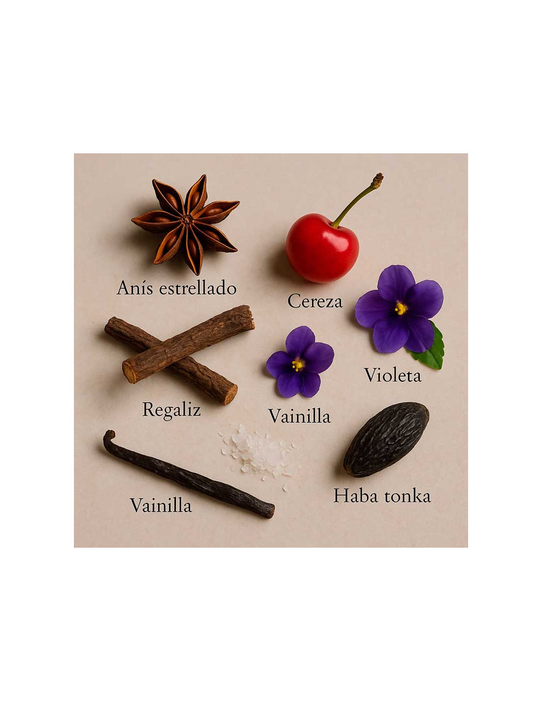 La fragància s’obre amb una barreja original de regalèssia, anís estrellat i baies d’heura, que aporten un acord dolç, lleugerament especiat i misteriós. Al cor, una combinació delicada de violeta, iris i amaril·lis dibuixa un caràcter floral suau i femení. A la base, el perfum es torna més càlid i golós amb notes de vainilla, ametlla i praliné, creant una estela addictiva i envoltant.