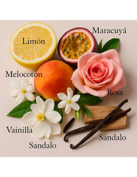 A fragrância se abre com um acorde frutado de mandarina, bergamota e pêssego. No coração, surge um bouquet floral suave e sofisticado composto por jasmim, lírio-d’água e peônia. Na base, aparecem notas quentes e profundas de baunilha, sândalo, vetiver e âmbar, que envolvem a pele com sensualidade duradoura e elegância atemporal.