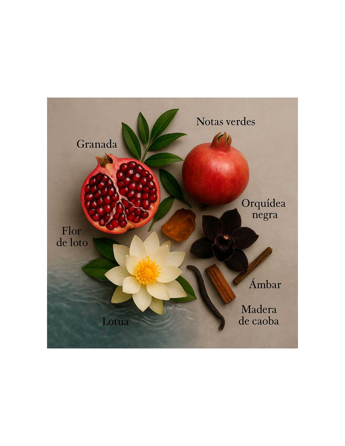 A abertura, com uma mistura de romã, caqui e notas verdes, traz um toque fresco e suculento. No coração, a fusão de orquídea negra, lótus e flores de champaca acrescenta exotismo e mistério. No fundo, surgem a violeta negra, envolvida em âmbar líquido e mogno, deixando um rastro profundo e sedutor.