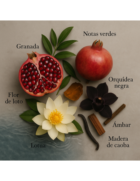 A abertura, com uma mistura de romã, caqui e notas verdes, traz um toque fresco e suculento. No coração, a fusão de orquídea negra, lótus e flores de champaca acrescenta exotismo e mistério. No fundo, surgem a violeta negra, envolvida em âmbar líquido e mogno, deixando um rastro profundo e sedutor.