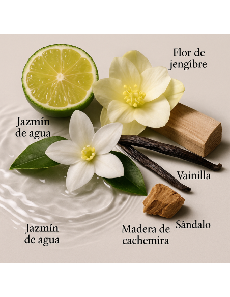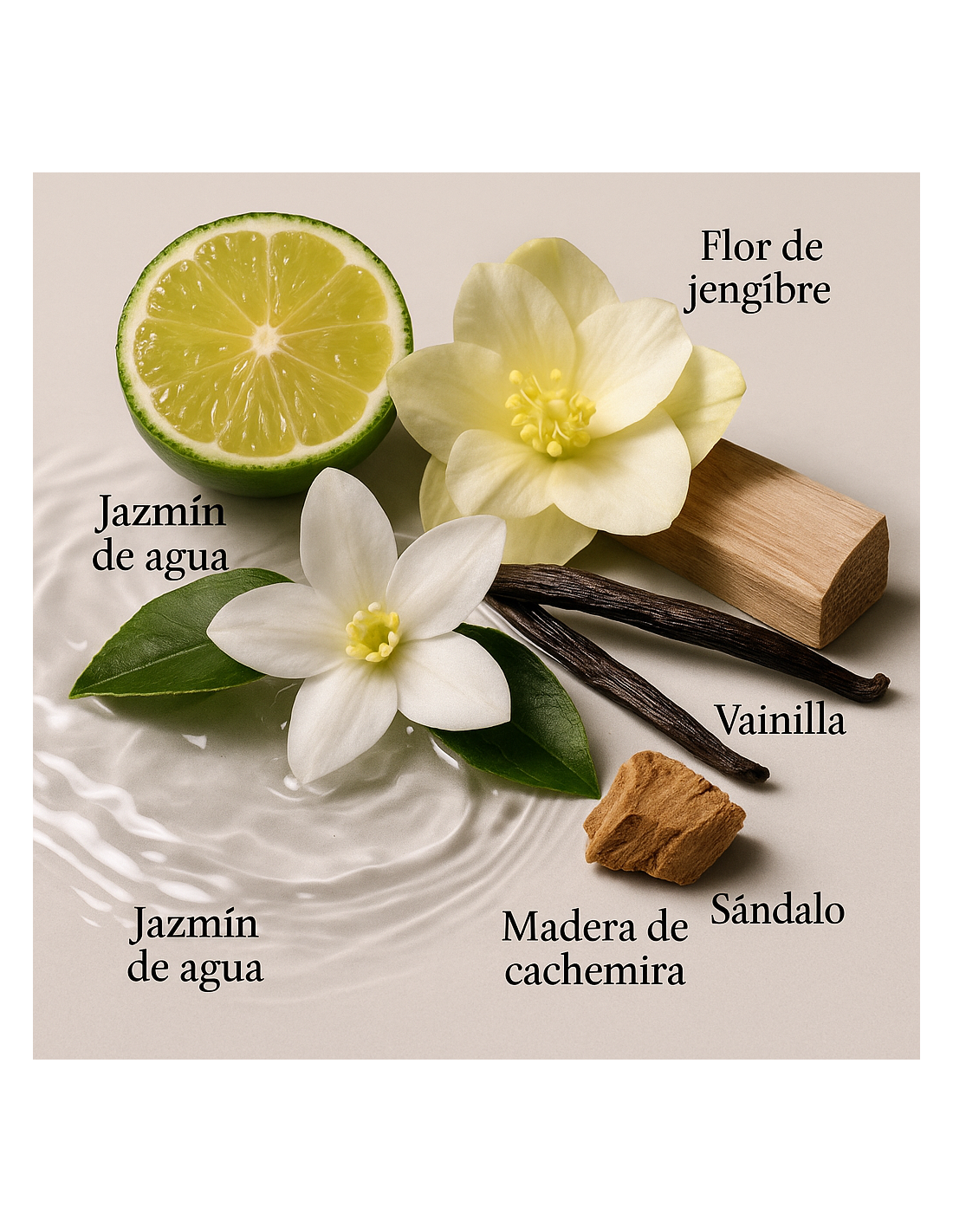 A saída, com uma mistura de tangerina verde e flor de gengibre, traz uma sensação fresca e vibrante. No coração, o acorde de sal e baunilha realça a sensualidade, enquanto o jasmim aquático adiciona um toque de pureza. Por fim, o fundo de âmbar cinzento, sândalo e madeira de cashmere cria um rastro quente, envolvente e profundamente viciante.