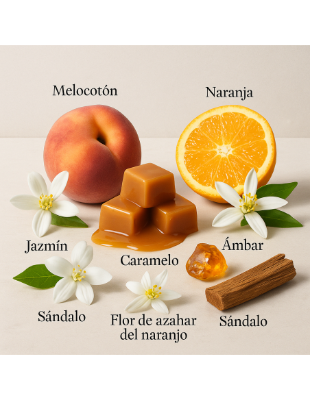 A saída combina um acorde de tangerina e laranja amarga com uma pitada de pêssego, criando uma sensação suculenta e luminosa. No coração, a fragrância fica mais sedutora com jasmim e flor de laranjeira, complementados pelo toque refinado da flor de laranjeira. No fundo, a mistura de caramelo, sândalo, madeira de guaiaco e baunilha cria um rastro reconfortante e viciante que evoca memórias de infância.